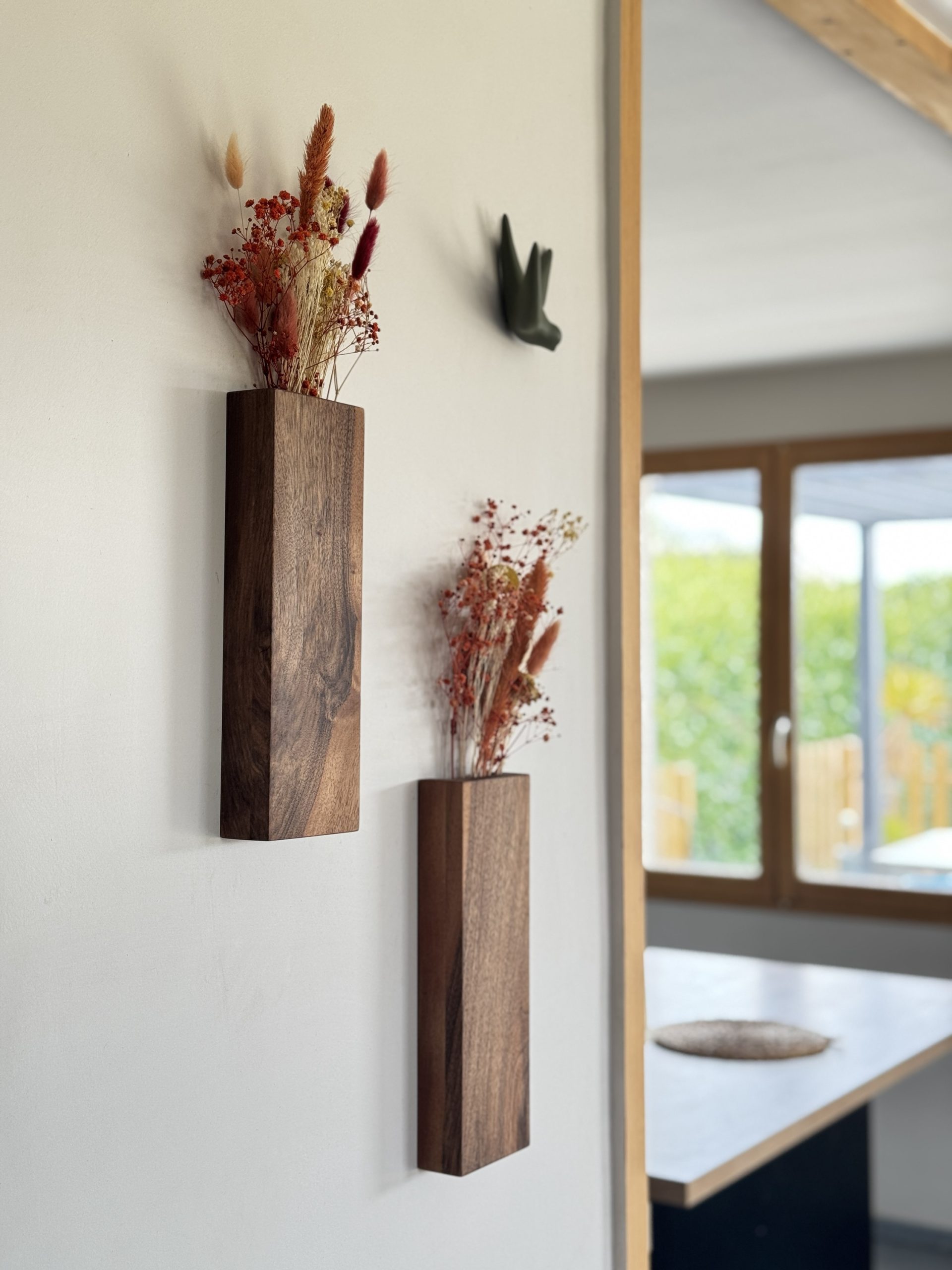 Ces vases muraux en noyer massif permettent d’ajouter une touche chaleureuse et naturelle sans surcharger votre espace.
