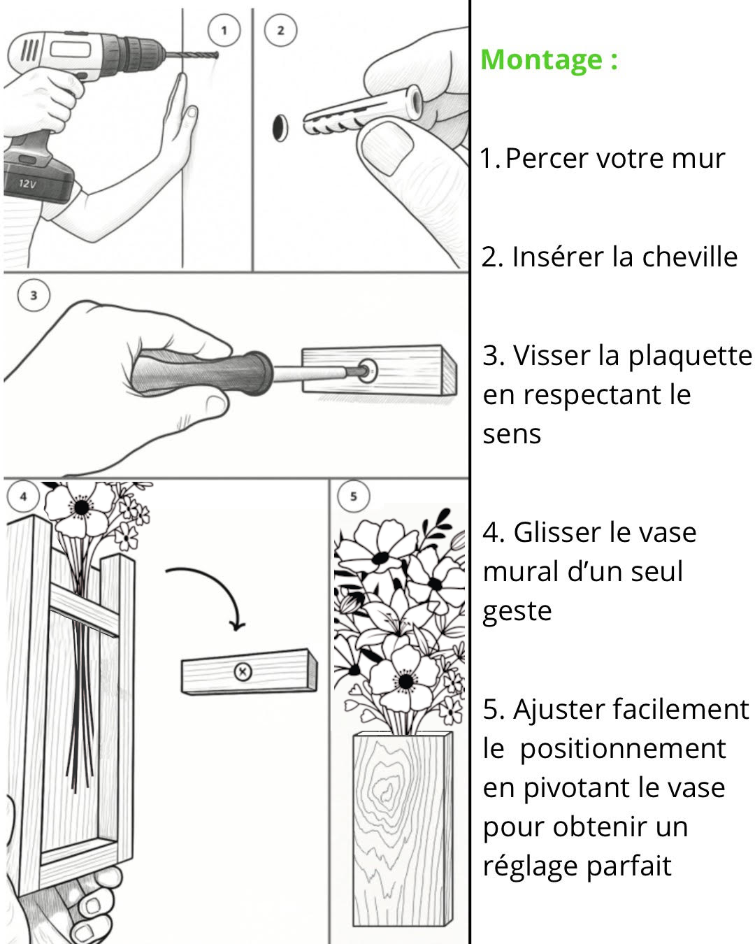 Il suffit d’une seule vis pour les installer solidement au mur. Grâce à ce système astucieux, vous pouvez les retirer et les remettre en place en un instant, ce qui facilite le changement de votre composition florale selon vos envies. De plus, leur ajustement est très simple, vous permettant de les positionner parfaitement à la verticale d’un seul geste.